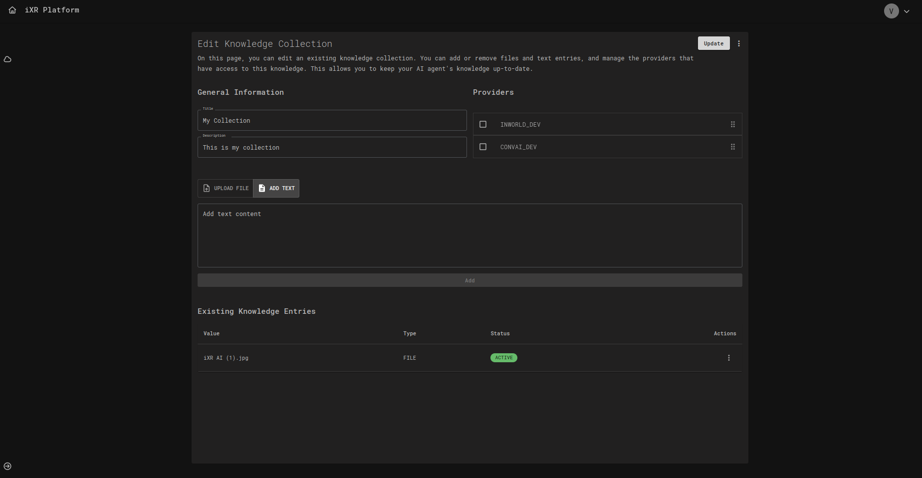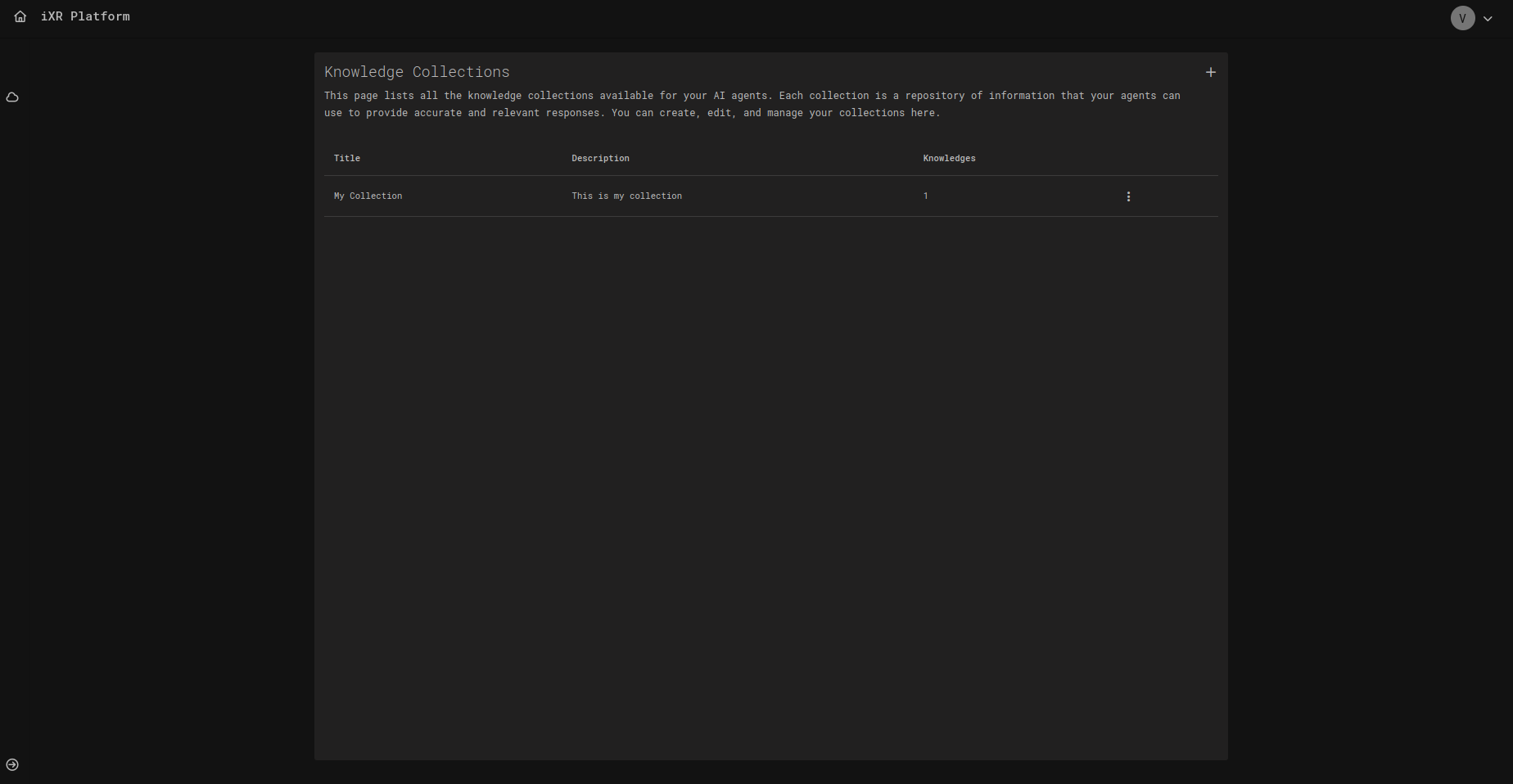 The Knowledge Collections page allows you to create, edit, and manage knowledge repositories that your AI agents can use. Each collection acts as a container for files and text entries, which are then linked to providers, enabling agents to deliver more accurate and context-aware responses.